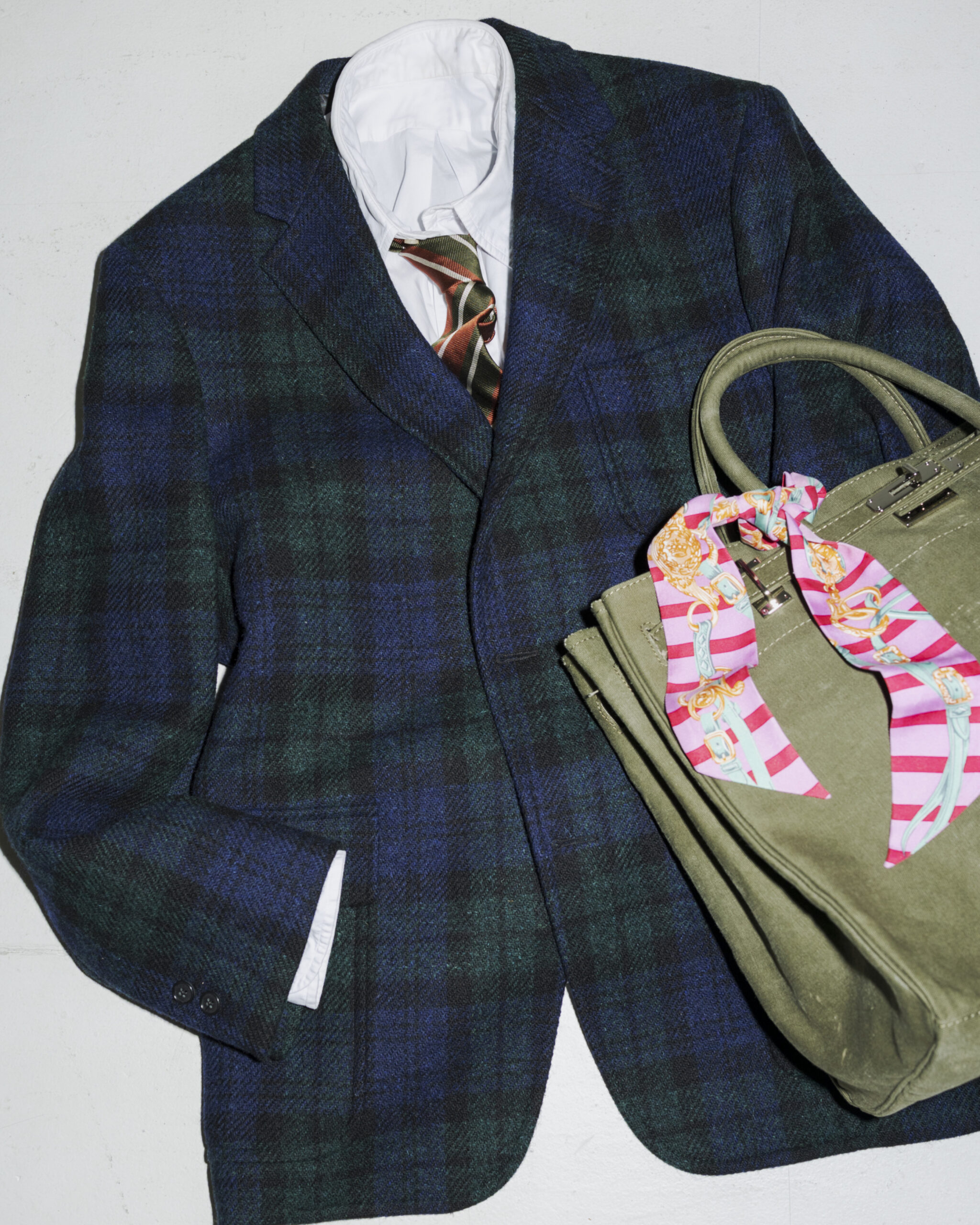 首元を印象づけるメンズアクセサリーとして、HERMÈSの名品“ツイリー”を提案。バンダナ感覚で気軽に取り入れられるヴィンテージスカーフ。