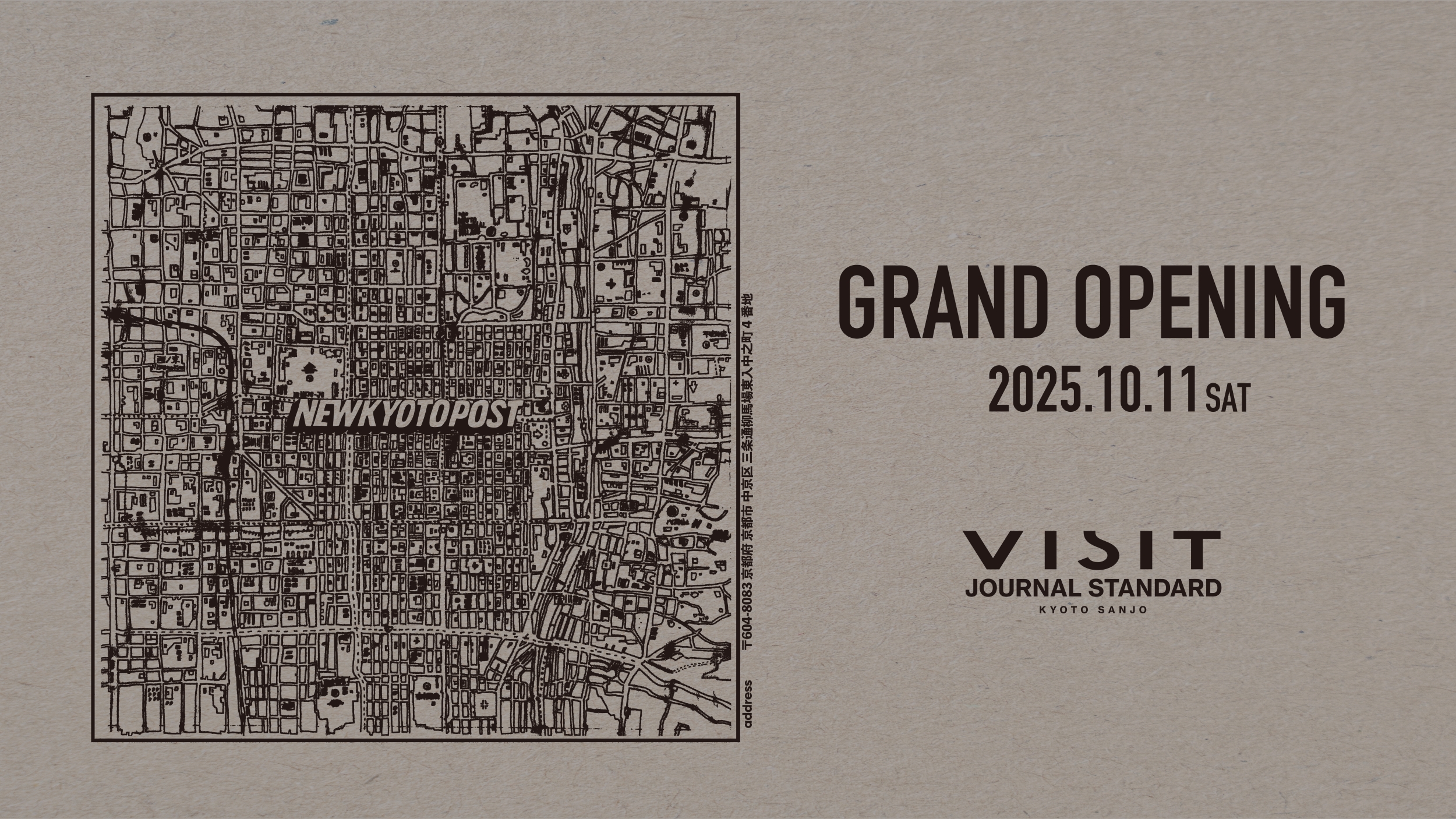 JOURNAL STANDARDは、2025年10月11日(土)、京都・三条にメンズ新店舗「VISIT JOURNAL STANDARD(ヴィジットジャーナルスタンダード)」をグランドオープンする。