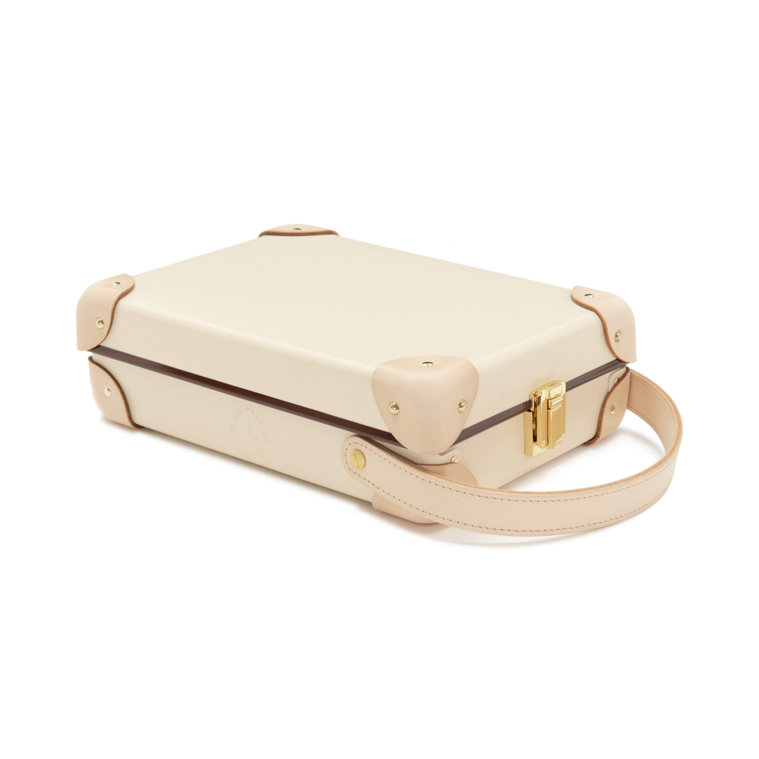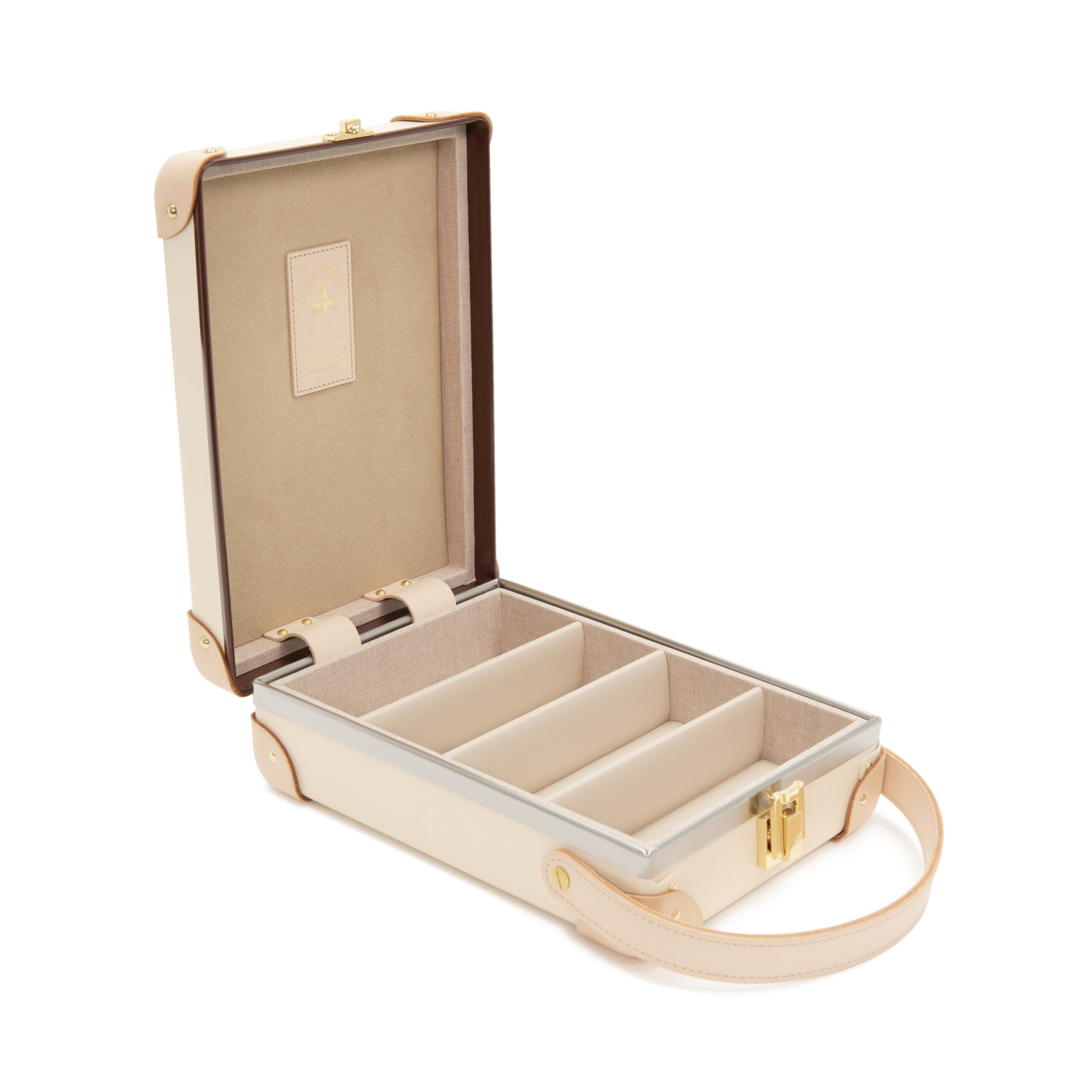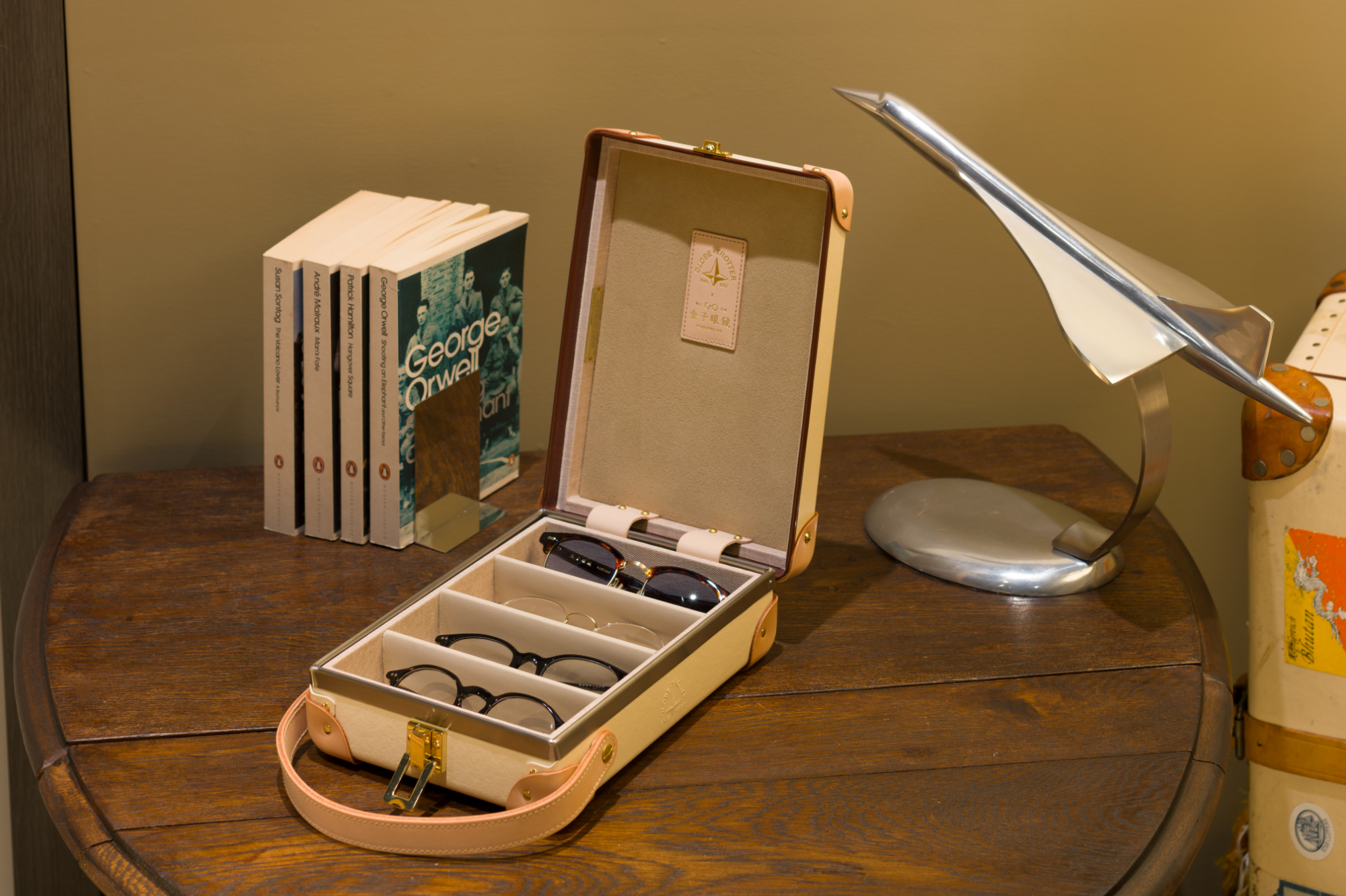 コラボレーションにより誕生したメガネケースは、グローブ・トロッターの普遍的なデザインと、伝統的なヴァルカン・ファイバーとコーナーレザーという素材のコンビネーションを継承しながら、4本の眼鏡やサングラスをコンパクトに収納可能なメガネケース。
